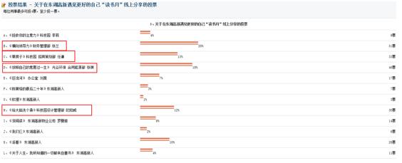 經(jīng)過24小時(shí)的線上匿名投票,財(cái)務(wù)管理部張?zhí)m 、光谷環(huán)保合同能源部張琪、科技園招商策劃部任謙、科技園設(shè)計(jì)管理部歐陽威4名投票排名最高的同事獲得200元、100元及50元(兩名)新華書店讀書券的獎(jiǎng)勵(lì)。獲獎(jiǎng)?wù)呖梢栽谖錆h市內(nèi)自行選購書籍,也可在東湖高新線上詩歌朗誦會(huì)現(xiàn)場(chǎng)選購。